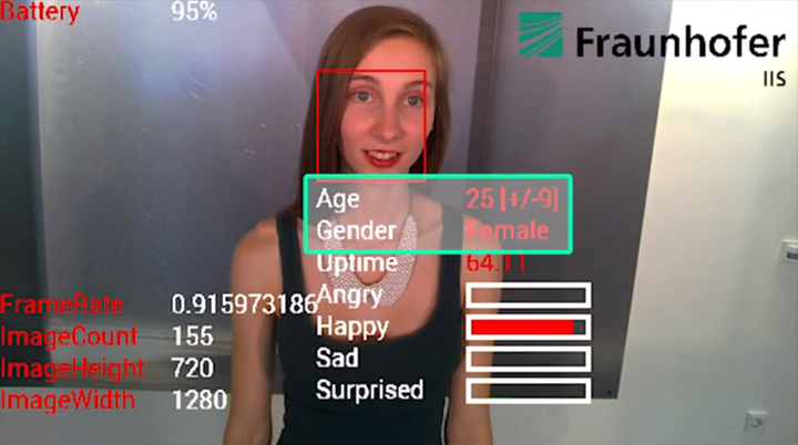 这款应用可以通过面部识别,推测对方的年龄、性别和实时情绪。Fraunhofer 建立了一个内含超过 1 万个脸部样本的数据库,通过人物脸部细节,例如眨眼的频率、嘴巴是否扬起,头部侧倾角度等来判断对方情绪。