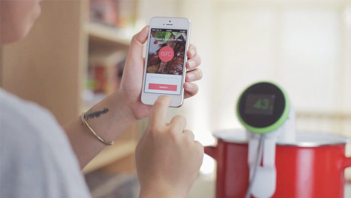 新版 Nomiku 外观看上去跟旧版区别不大,依旧酷似曲球棍。不同的是,新版 Nomiku 体积更小,自带的夹子设计能保证设备更稳固地贴于锅具内侧,触控屏的面积也变得更大。此外,新版配备 Wi-Fi 连接功能,现在用户不但可以通过手机上的应用程序远程监控及调试设备,还可以下载及分享食谱。