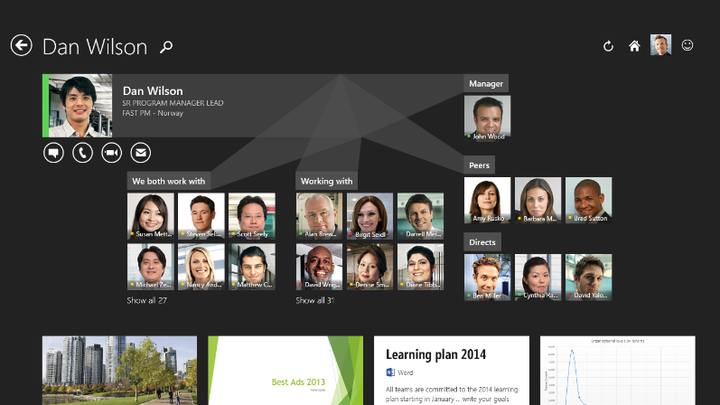 今年早些时候,微软公布了一款名为 Delve 的智能商务搜索工具,这款代号“Oslo”的工具利用“机器学习”技术,能够针对用户的信息进行主动分析,并能像 Flipboard 一样,将结果在个性化界面中呈现出来。昨天,微软正式推出了 Office Delve。
