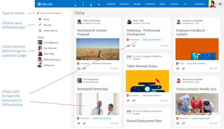 作为 Office 365 的一部分,Office Delve 能够利用基于 Office Graph 的机器学习数据库,对用户信息进行深入分析,进而来收集相关的工作信息。在最初版本中,Office Delve 可以从 Exchange、OneDrive 商业版、SharePoint Online 以及 Yammer 等企业社交网络中抓取内容。