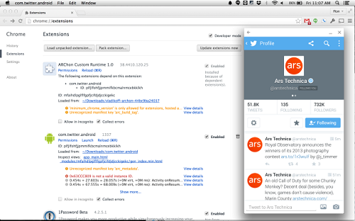 鉴于 Google 是通过 ARC 让 Chrome 在浏览器内运行代码,Vladikoff 做了一个定制版本的 ARC。通过拖拽文件到浏览器加载,即可运行任何 Android App。但是 ARC 不支持原始的 Android APK,因此 Vladikoff 还制作了一个名为 chromeos-apk 的转换工具。