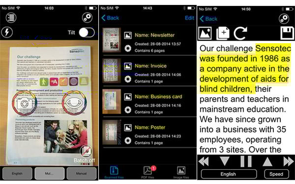 利用新的识别模式、图像处理技术以及智能硬件设备(智能手机等),KNFB Reader 允许用户通过相机来大声播放所摄范围内的文字内容。由此来看,不管是餐厅的菜单,还是某款产品的说明书,KNFB Reader 都能够将内容同步转化成声音,这能够为盲人们的生活提供极大便利,增强盲胞们的生活独立性。