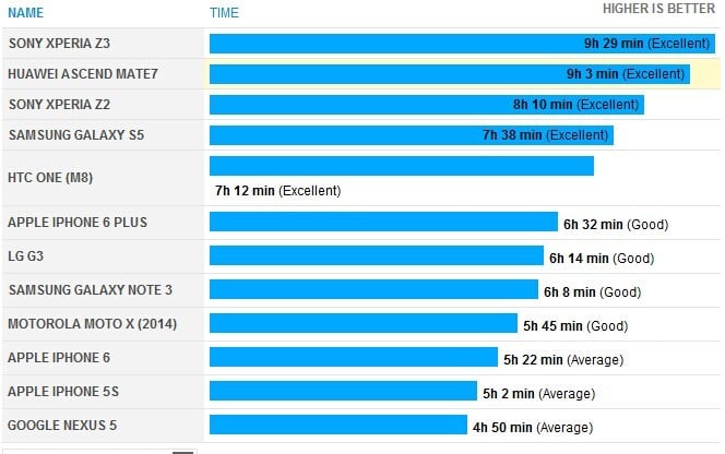 此次续航能力测试调查中,突破 9 小时大关的除了 Xperia Z3,还有华为的 Mate 7,不过其电池容量为 4100 mAh,相较之下,Xperia Z3 7.3 毫米薄的机身中所装电池容量为 3100 mAh,则显得更加难得。Xperia Z2 排行第三,8 小时 10 分的续航能力也值得称赞。