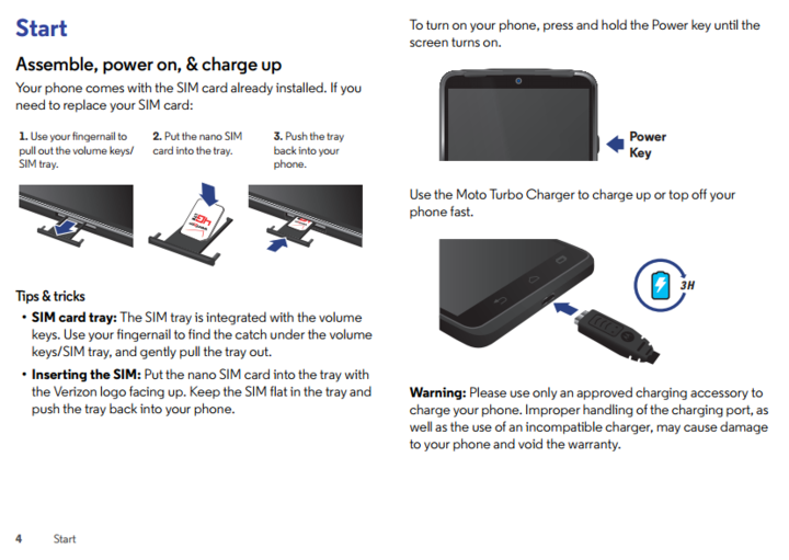 一个多月前,爱范儿报道了摩托罗拉与美国通讯公司 Verizon 正合作推出新机 Droid Turbo,最近,此款新机连同其衍生机 Moto X Play 获得 FCC 认证,正蓄势待发,而在 MotoFirmware.com 上流出的一份包含了 Droid Turbo 相关信息的快速启动指南,也进一步确认了此款新机的各项属性。