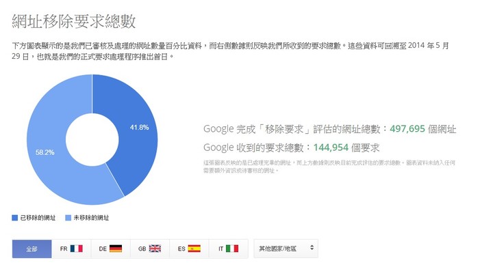 截至目前,Google 总共收到了 144954 条申请,需要进行评估的链接有近 50 万条。而经过评估后,Google 已经删除了其中 41.8% 的信息,主要受影响的网站以 Facebook 为首,被移除了 3332 条链接。但有接近 58% 的“被遗忘权”(right to be forgotten)被驳回。