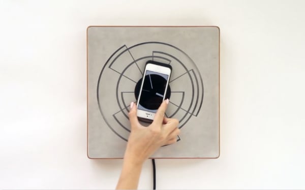 目前为止,这些功能已经足够酷炫了,Spira 令人惊叹的功能还不止于此。壁挂的充电座还是一个指针时钟。怎样显示呢?将手机吸附在充电座上后,旋转到指定位置,手机屏幕就会显示指针和表盘了,它和背后的充电座表面完美融合,共同组成一个挂钟。依靠重力感应,手机移动也不会影响表盘显示。