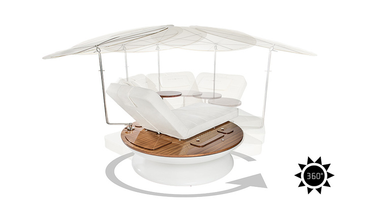 了解了 Remmus 的功能之后,你会觉得这把躺椅的设计理念就是让躺在上面的人不想下来。首先,Remmus 能够跟踪太阳,并通过 360 度的旋转来调节照射在你身上的光线。如果你觉得热,圆形甲板能够喷洒水雾,为你降温。晚上,躺椅还会打开 LED 灯为你照明。