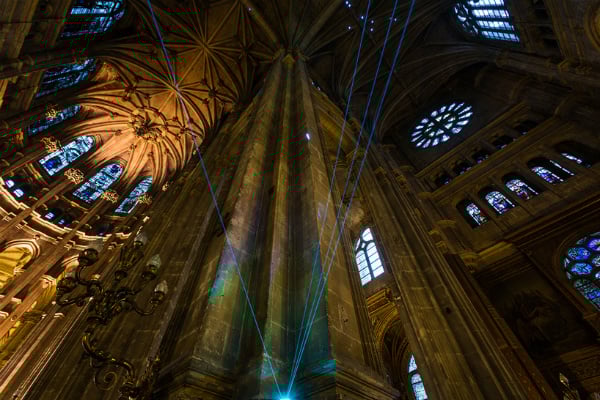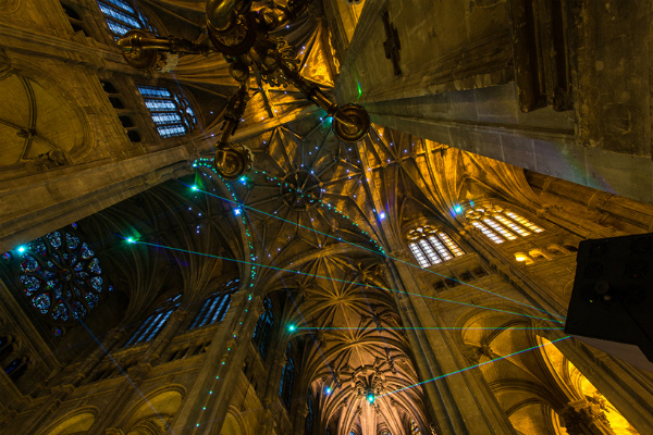 这套互动体验系统是通过安装在教堂支柱上的激光灯来实现的,激光能够沿着拱门和内壁到达天花板,然后形成光影交织的星空。