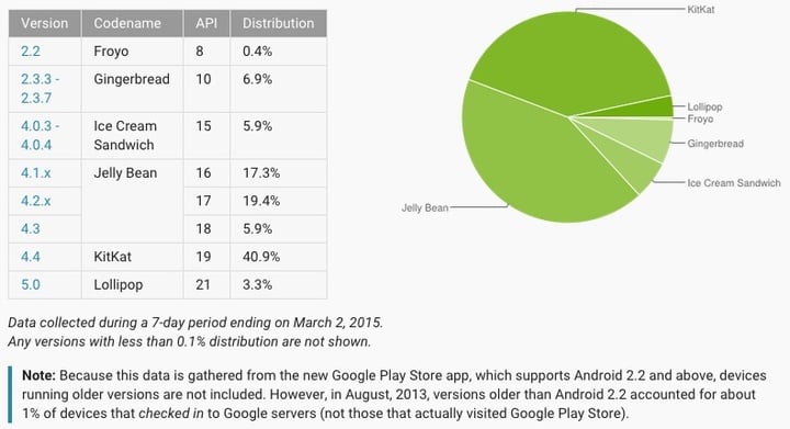 MWC 期间发布的多款机型如 Galaxy S6、HTC One M9 和 Xperia Z4 Tablet 都搭载了基于 Android Lollipop 的系统,相信随着这些机型正式开售,Lollipop 的份额会有一个相对较大幅度的上升。然而由于其开放性和各厂家的深度定制,Android 不能像 iOS 一样统一推送,极大地阻碍了低版本向上升级的速度。