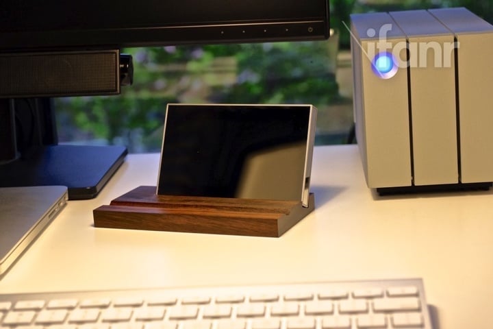 在颇具风格的硬盘外观基础上,设计师添加了孟加锡(Macassar)黑檀木打造而成的基座,让这件产品摇身变为办公桌上的艺术展品。在桌面上,它除了充当一块移动硬盘,也是一面带木质底座的镜子。