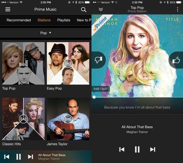 Prime Stations 是基于艺人与类型进行分类的无广告音乐电台,能为用户提供海量音乐内容。该功能还为用户提供了个性化推荐功能:当一首歌被播放的时候,你可以选择“顶(thumbs up)”或者“倒(thumbs down)”。经过一段时间的使用以后,这项服务便会根据播放记录和反馈情况定制用户播放列表,为你推送符合口味的音乐。
