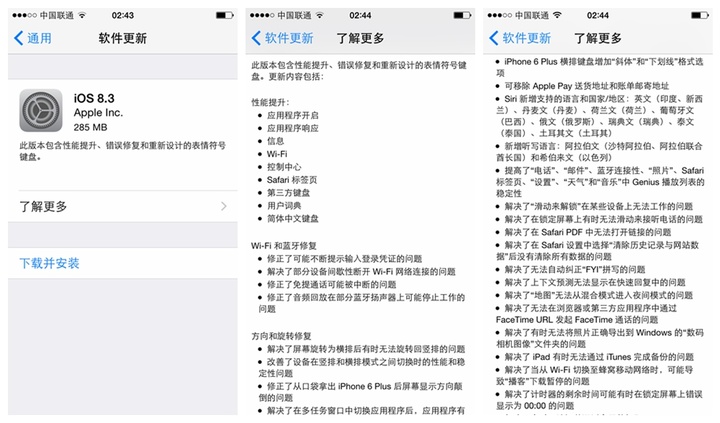 新版本系统最后一个比较值得关注的改进是,iOS 8.3 更新了表情符号键盘,新增了 300 多个表情符号。整个升级包大小为 285MB,安装时间在三四分钟左右。