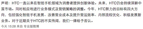 HTC 宏达前日举办了股东大会,董事长王雪红因为近期股票表现不好向股东鞠躬道歉,有传闻 HTC 裁员 50%。今日,HTC 在官方微博上发表了如下声明: