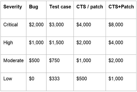 这个奖励计划鼓励开发者和研究人员去寻找 Android 开源项目(AOSP)和 OEM 厂商代码中的 bug,kernel、信任区以及原型中的漏洞也包括在内。安全漏洞提交给 Google 有获得现金奖励的机会,奖励按安全系数等级划分如下: