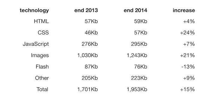 从各部分元素增长速度来看,在过去一年中增长最多的是 CSS 和图片。得益于 html 5 和响应式设计的流行,CSS 的使用在过去一年中增长了 24%,JavaScript 的使用并没有减少,Flash 的使用正在下降。