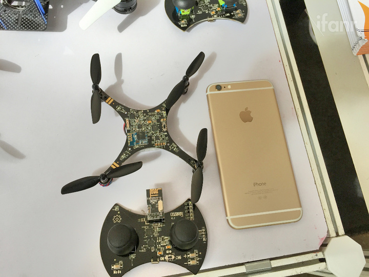 他们的展位很容易引起我们的注意,桌子上摆满了小型飞行器。事实上,这些小型飞行器,就算加上他们的遥控器,体积和现在的手机大不了多少,上图中的手机是 iPhone 6 Plus。