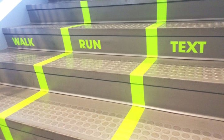 为拯救这些走路不看路的低头族,犹他谷大学另辟蹊径,在一座教学楼中重新设计了交通规则。该校为生命健康中心的楼梯设计了三条道:走路、跑步、发短信。这张图片传到网上后,引起了各大媒体的疯狂转发。