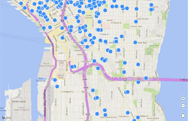 地图上的每个蓝色圆点都代表着一个项目。根据西雅图市中心协会(Downtown Seattle Association)这个月早前的报道,目前城市已经有 106 个项目,规模不小。