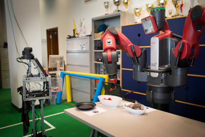 比如为人类做早餐。Baxter 是一只原地不动的机器人,可以依靠双手来煮鸡蛋;CoBot 没有手臂却擅长在室内游走,可以用前置篮筐来递鸡蛋。双方可以无线通话,最重要的一点是,在事情没有按计划进行的时候,他们还能给对方以及时反馈。