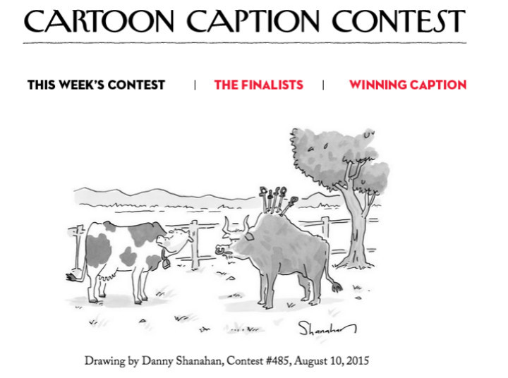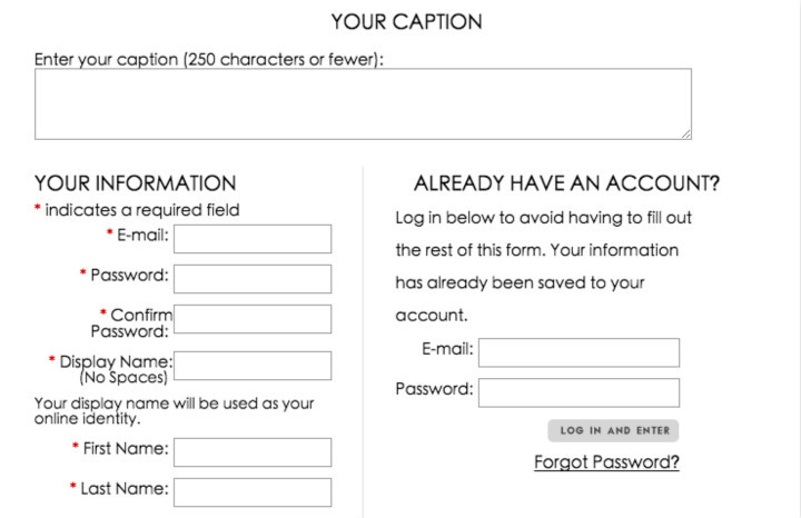 如图所示,New Yorker 杂志官网上每周都有标题竞赛,读者直接在网站上回复并提交个人信息就可参与比赛。