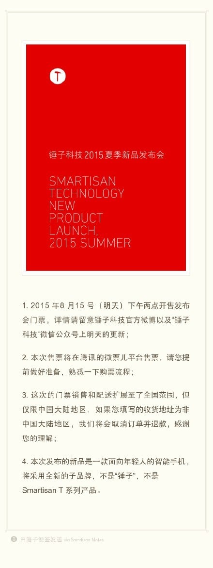 锤子将于 8 月 25 日 晚上 19:30 ,在上海梅赛德斯-奔驰文化中心举行夏季手机新品发布会。并且在 8 月 15 日,也就是明天下午两点开卖发布会的门票。