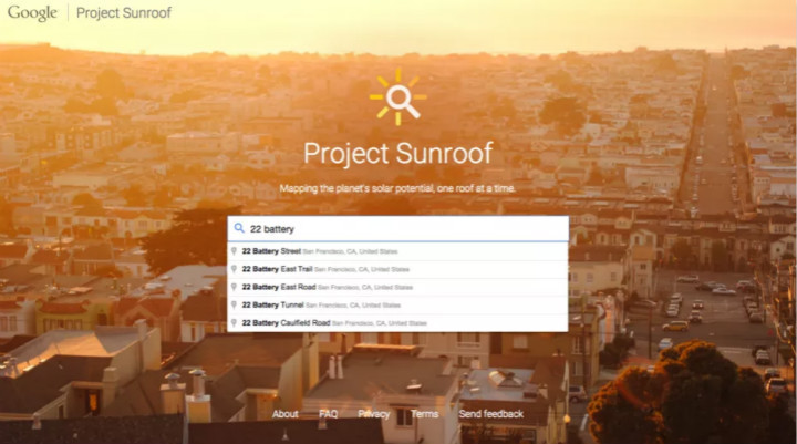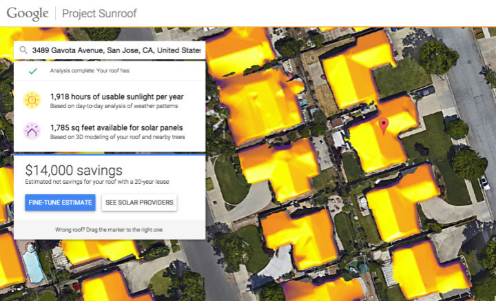 Google 现在推出了 Project Sunroof 这一在线工具。用户只需要输入地址,它就可以在 Google 地图上查找到你家的位置,结合其他数据库信息,比如屋顶的 3D 模型,附近建筑和树木的阴影投射,一年中所有可能的太阳位置,还有天气状况等,它就可以分析出你个人的房屋情况。