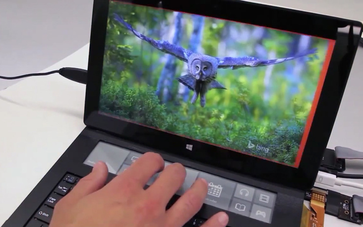 根据 Engadget 的报道,微软正在开发一款名为 Display Cover 的产品。这款键盘上搭载一块 1280 x 305 附带触控功能的 E-ink 显示屏。与平板电脑组合后,这款屏幕会出现一个简单的 Metro 界面,上面会有几个基本应用的快捷方式,方便用户在使用键盘时做相应的呼出,而不需要再点按屏幕。同时,这块屏幕对于平板本身的触摸屏来说,也能作为一个触控区域的延伸和扩充。例如: