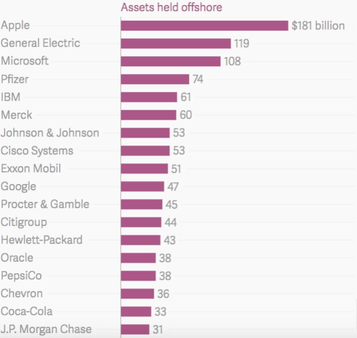 报告显示,财富五百强中有接近 3/4 的公司都存在避税问题,而他们的手法也都差不多:将知识产权转移至国外,利用税法漏洞及海外不同国家之间的税法差异,从而做到“在有关税率最低的地方交相应种类的税”。(比如苹果,利用爱尔兰的法律政策,它可以将税率降低至 2%。)