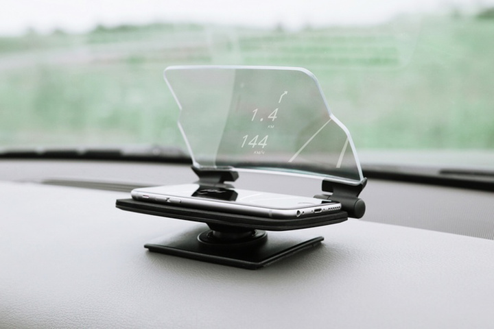 那么,有没有其他的方法让司机的视线不会转移到其他的地方,也能兼顾手机操作呢?Hudway 公司提供一个新的方案:用 APP 和一个固定的结构,将手机显示的驾驶信息投影到车前的挡风玻璃上。