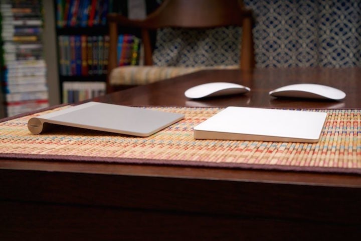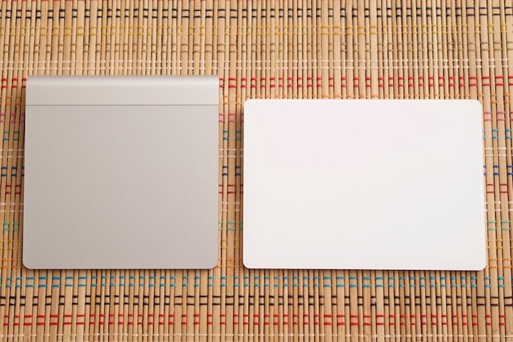 触摸板 Magic Trackpad 2 的改进最明显,尤其是外观。有了它,谁还愿意去面对旧 Magic Trackpad 那张四方四正的大脸呢。去掉 AA 电池槽之后,新触摸板采用了扁平的底座,后背到前面的坡度也比上一代明显减小,使用感受应该会明显改善。