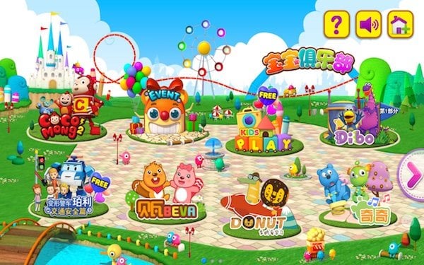 打开宝宝俱乐部,可以看到游乐广场上有很多个「小镇」,这些「小镇」实际上就是供宝宝观看学习的课程内容。这些内容由 Pororo, Poli 等多家国际内容合作商提供,你可以通过点击右上角的添加按钮来获取更多内容。