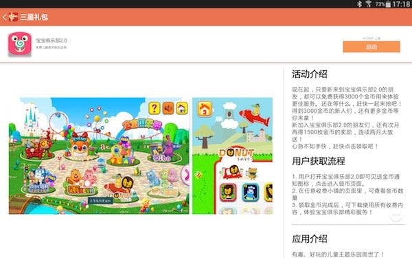 宝宝俱乐部提供了一部分的免费内容,剩下的需要通过金币付费购买。而如果你是 Tab S 的用户,就可以享受到价值 345 元的免费礼包。从 2014 年 7 月 1 日开始,主要包括: