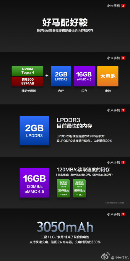 小米 3 的运行内存为 2GB LPDDR3,电池容量 3050 mAh,支持快速充电,充电时间缩短了 30%。