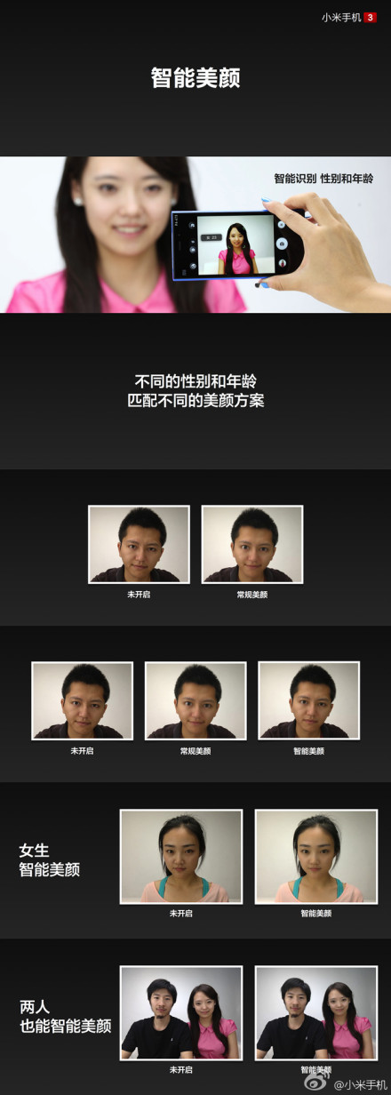 据介绍,小米 3 相机能识别年龄和性别,并根据不同性别和年龄,匹配不同的美颜方案。